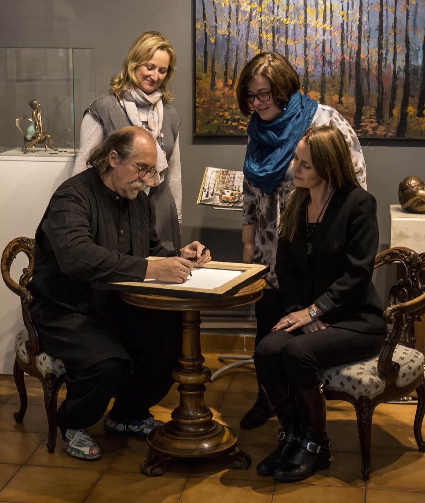 Onishenko applies by hand a coating to the prints to give the reproductions the look and feel of the originals. He is photographed below signing the canvases for the Charity Gala.